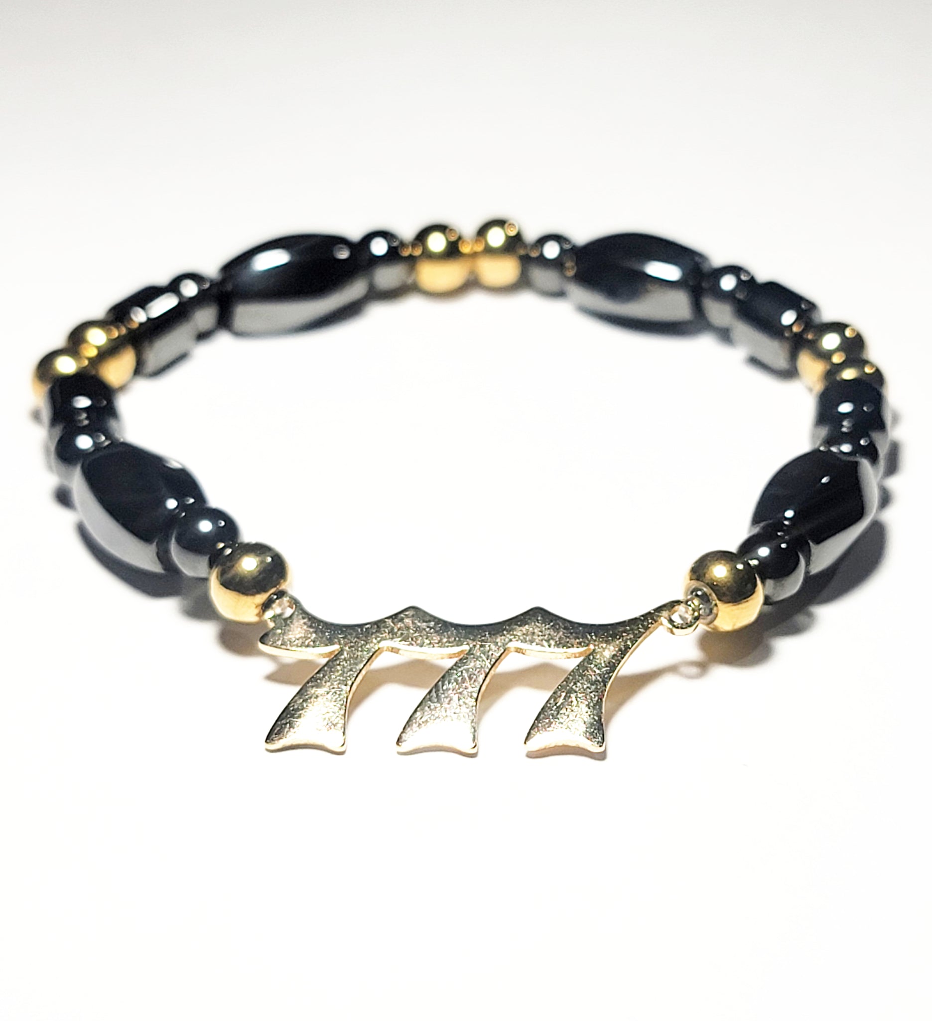 This bracelet is hand made with strong elastic wire, gold color stainless steel beads, high powered magnetic beads, and a gold filled angel number charm.